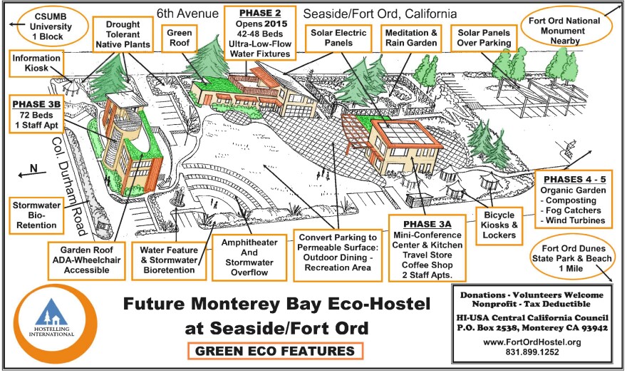 In Seaside, the non-profit Hostelling International is in the process of turning three abandoned buildings into a 120 bed hostel and small conference center called the Monterey Bay Eco Hostel. Phase one of the project is slated to open late 2016 with 48 beds in a building that used to be an infirmary.