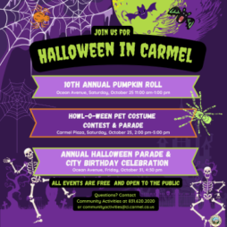 Join us for one of Carmel’s longest standing traditions – no need anymore to steal pumpkins to roll down Ocean Avenue under the cover of darkness! We provide the pumpkins, you bring your friends and family. Find out what size pumpkin rolls best in the bright light of day where the zombies can’t get you.