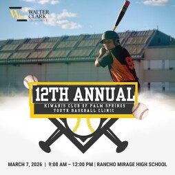 Walter Clark proudly sponsors the 12th Annual Youth Baseball Clinic, hosted by the Kiwanis Club of Palm Springs. This free, hands-on clinic helps young athletes build baseball skills, confidence, and teamwork through positive coaching from local teams and former professional players. The event takes place Saturday, March 7, 2026, from 9:00 a.m. to 12:00 p.m. at Rancho Mirage High School.