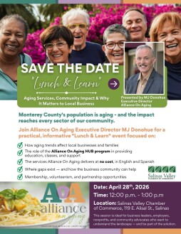 SALINAS, Calif. — Alliance On Aging will host two upcoming Lunch & Learn events designed to help business leaders, nonprofits and community members better understand the growing needs of Monterey County’s aging population and the role local partnerships play in supporting older adults.