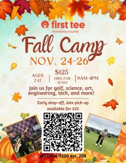 The Fall Camp at First Tee – Monterey County, held from 9 a.m. to 4 p.m., is designed to spark curiosity and confidence through a blend of golf instruction, STEAM activities, art, engineering, outdoor play, and team-building. The camp is $125, and FREE for Alisal Union School District (AUSD) students. Early drop-off and late pick-up are available for an additional $25.