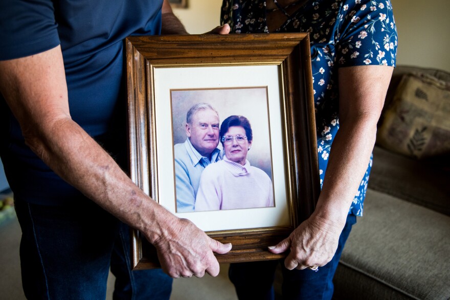 Mark and Kathy Allen hold a photo of Mark's parents at their home in Sebastopol on July 29, 2020. Mark and Kathy evacuated Mark's mother and several other residents of the Villa Capri retirement community as the Tubbs Fire approached in October of 2017.