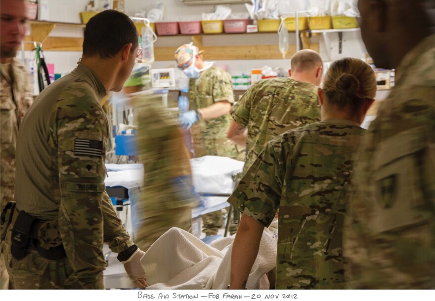 One image that sticks with me shows the aftermath of treating casualties. I took it in the aid station after spending hours attending to several wounded Afghans–some of them didn't make it. When I walked out, folks were heading to the chow hall for dinner, going to the gym and just hanging out. I was smacked with the reality that no one knew what we'd just seen and done. It was just another day on the FOB for everyone else.