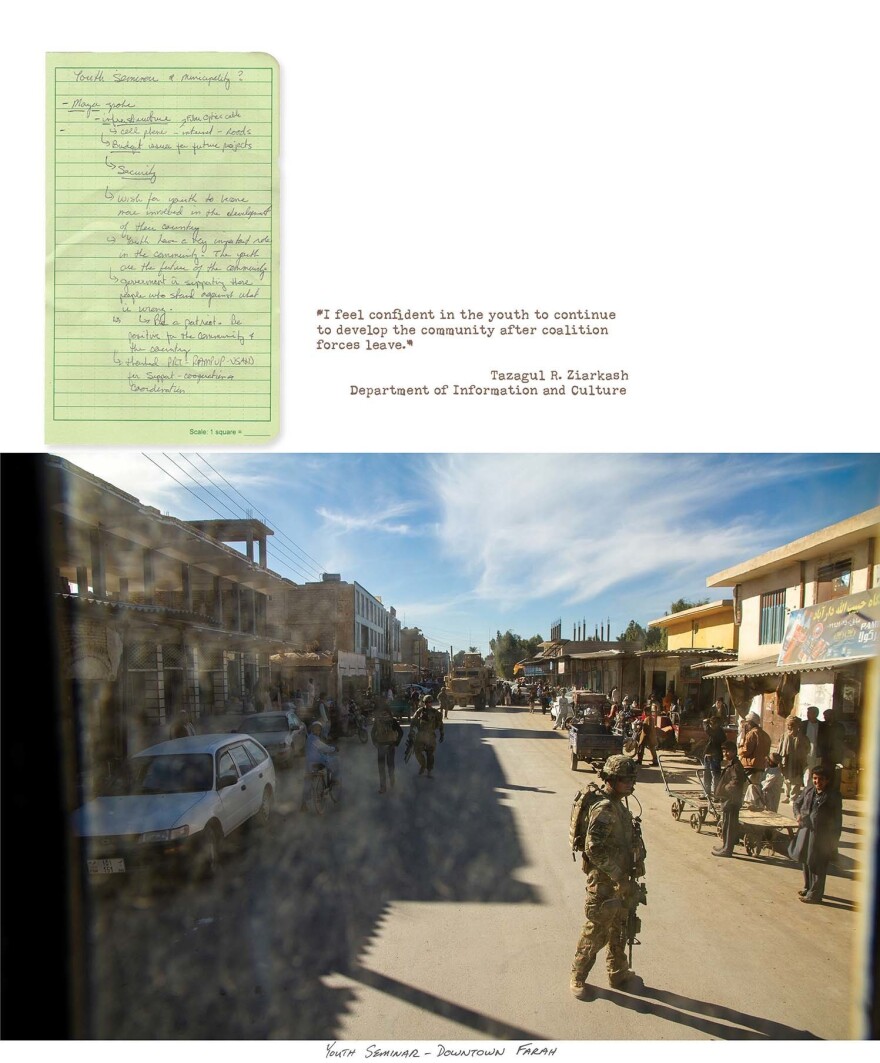 Q: Your work notes gives us a glimpse of your daily routine and the use of poetry feels very reflective. Tell us a bit more about life on the base in Farah.