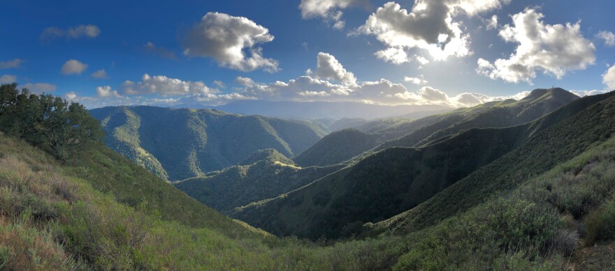 To see these efforts in practice, Wyckoff takes me on a tour. First stop -- a grassy ridge that overlooks one of the six creeks in the preserve. This ridge has undergone mastication recently, which is when a huge lawn mower grinds up all the vegetation. Cattle have also been grazing on the land, and soon they will have a prescribed burn.